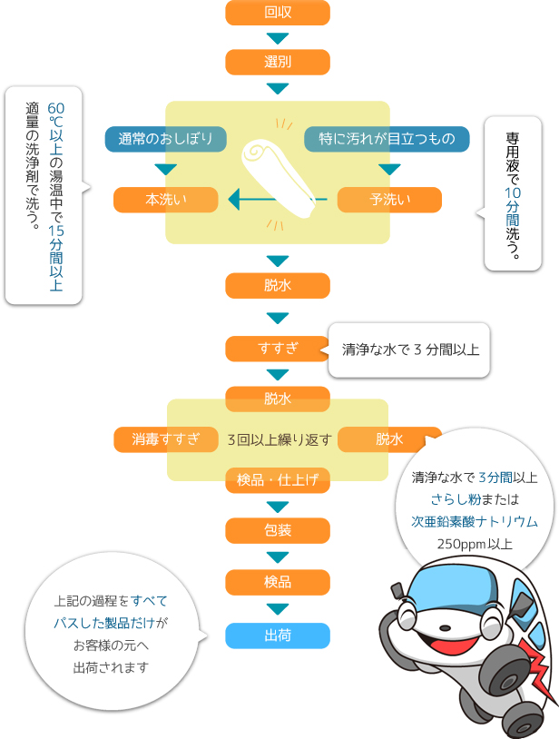 マル進おしぼりは清潔・安全に使えるおしぼりをお客様にご提供するため、自社工場で厳正な衛生管理のもと使用済みのおしぼりを加工、出荷していますので安心してご利用頂けます。