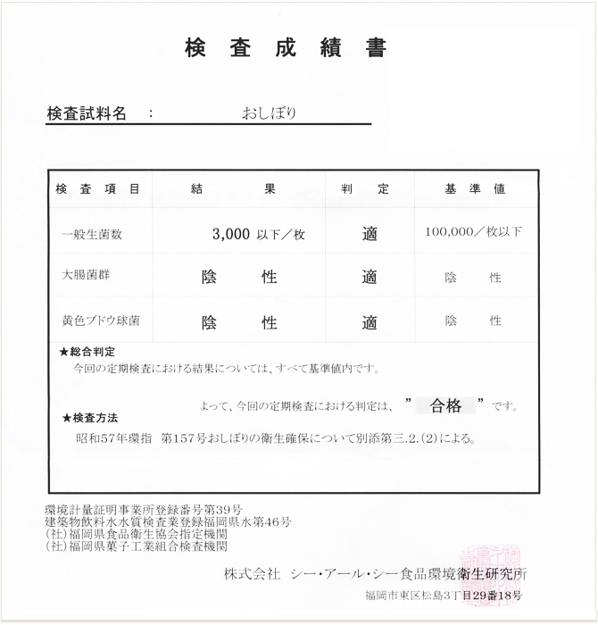 厚生労働省の指導では、一枚のおしぼりには一般細菌が10万以下である事と規定されていますが、マル進おしぼりは、この合格水準を大幅にクリアする3,000以下という高成績をずっと続けています。